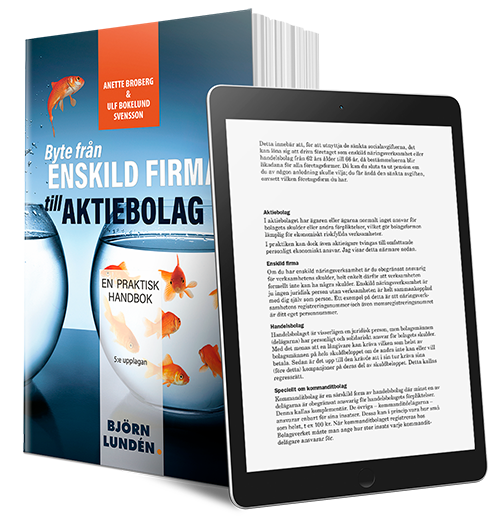 BYTE FRÅN ENSKILD FIRMA TILL AKTIEBOLAG är en praktisk handbok som både beskriver fördelarna och nackdelarna med aktiebolag kontra enskild firma – och som visar hur det går till att praktiskt byta från enskild firma till aktiebolag.