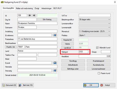 - De kunder där försäljningen omfattas av OSS till kan du med fördel lägga in i en särskild kundkategori, exempelvis OSS, i fältet Kategori under Uppläggning – Kunder.