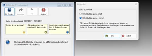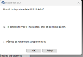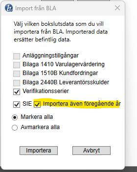 Det som är nytt är att man nu kan importera även föregående år. OBS! Vill man INTE importera från föregående år då ska man bocka ur detta. Denna funktion är bra för nya kunder/företag som du ska göra bokslut för i BL Bokslut.