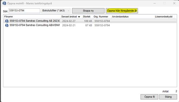 Här ser man de filer som ligger för denna kund/ företag. Vill man öppna från föregående år då väljer man det uppe till höger.