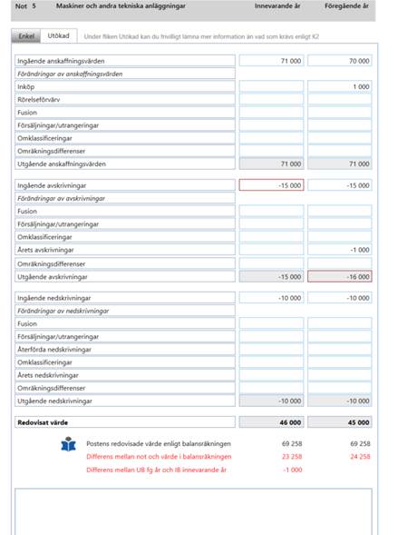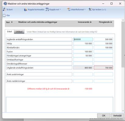 Som ett led i detta har vi uppdaterat alla noter som har redovisat värde att IB och UB har samma värden. Vid differenser mellan utgående balanser föregående år jämfört med ingående balans innevarande år finns en varning (rödmarkerat fel) direkt i noterna och även under kontroller av årsredovisningen.