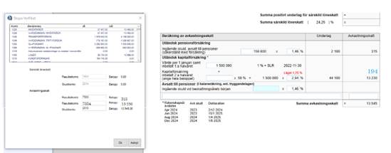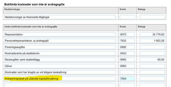 I samband med detta har vi lagt till konto 7554 ”Avkastningsskatt på utländska kapitalförsäkring” som ej avdragsgill kostnad i bilaga 2512. Detta för att hjälpa användaren att göra en korrekt skattemässig hantering av denna avkastningsskatt.