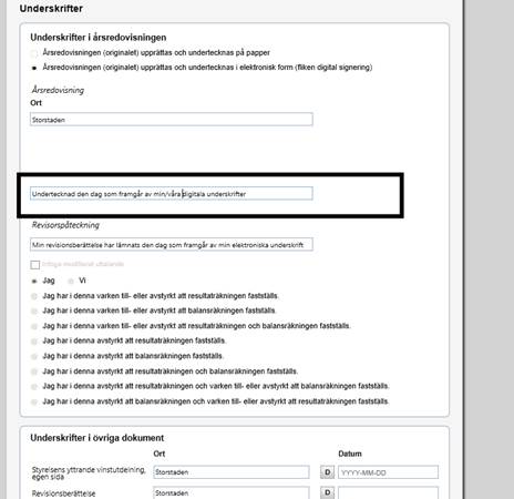 Vid markering av digital signering så har vi nu även lagt in en förtryckt text i fliken underskrifter, Undertecknad den dag som framgår av min/vår elektroniska underskrift, där styrelsen har digitala underskrifter.