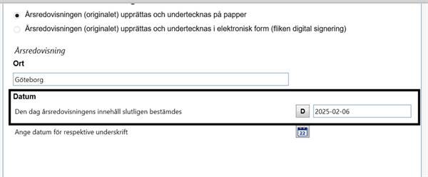 Det som är nytt i årsredovisningsdelen – underskrifter – är att det ska framgå den dag årsredovisningens innehåll slutligen bestämdes och var färdig för undertecknande. Syftet med att årsredovisningen ska dateras är att det ska bli tydligt vilka företrädare som ska underteckna årsredovisningen. Dateringen kan också ha betydelse vid en bedömning om årsredovisningen behöver göras om på grund av att det inträffat händelser av väsentlig betydelse efter att årsredovisning daterats, men innan alla företrädare undertecknat årsredovisningen.