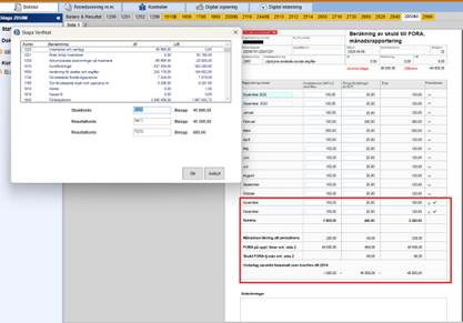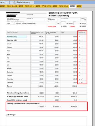 Nu finns en ny bilaga som heter 2950M och som avser FORA månadsrapportering. Månaderna som är i första kolumnen sätts enligt filens räkenskapsår och är inte redigeringsbara . Om du har ett förlängt räkenskapsår eller vill justera något ytterligare använd då de två översta raderna ( ovanför första månaden i filens räkenskapsår) för att få med i avstämningen. Du kan som vanligt bifoga fakturor från Fora och fylla i beloppen per månad för avtalspension och övriga försäkringar ( ej underlag för särskild löneskatt). Systemet summerar totalen för enskild månad men även för hela året. I flesta fall kommer det alltid vara minst två perioder som inte är betalda och som ska periodiseras för det aktuella räkenskapsåret. Du bockar i de perioder som ska periodiseras. Summan av dessa visas på raden ” månadsavräkning att periodisera”. Underlaget för särskild löneskatt gällande pensionskostnader till FORA summeras längre ner. Beloppet kan hämtas in till bilaga 2514.