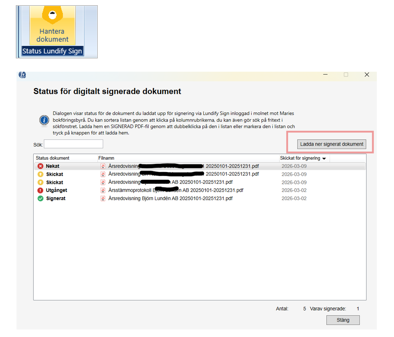 Vi har förbättrat och förtydligat vissa vyer när ni använder tjänsten Lundify Sign för digital signering. Om du går till Status signerade dokument -Lundify Sign då har vi lagt till en knapp som heter ” Ladda ner signerat dokument”. Det blir tydligare än att dubbelklicka på ett dokument.