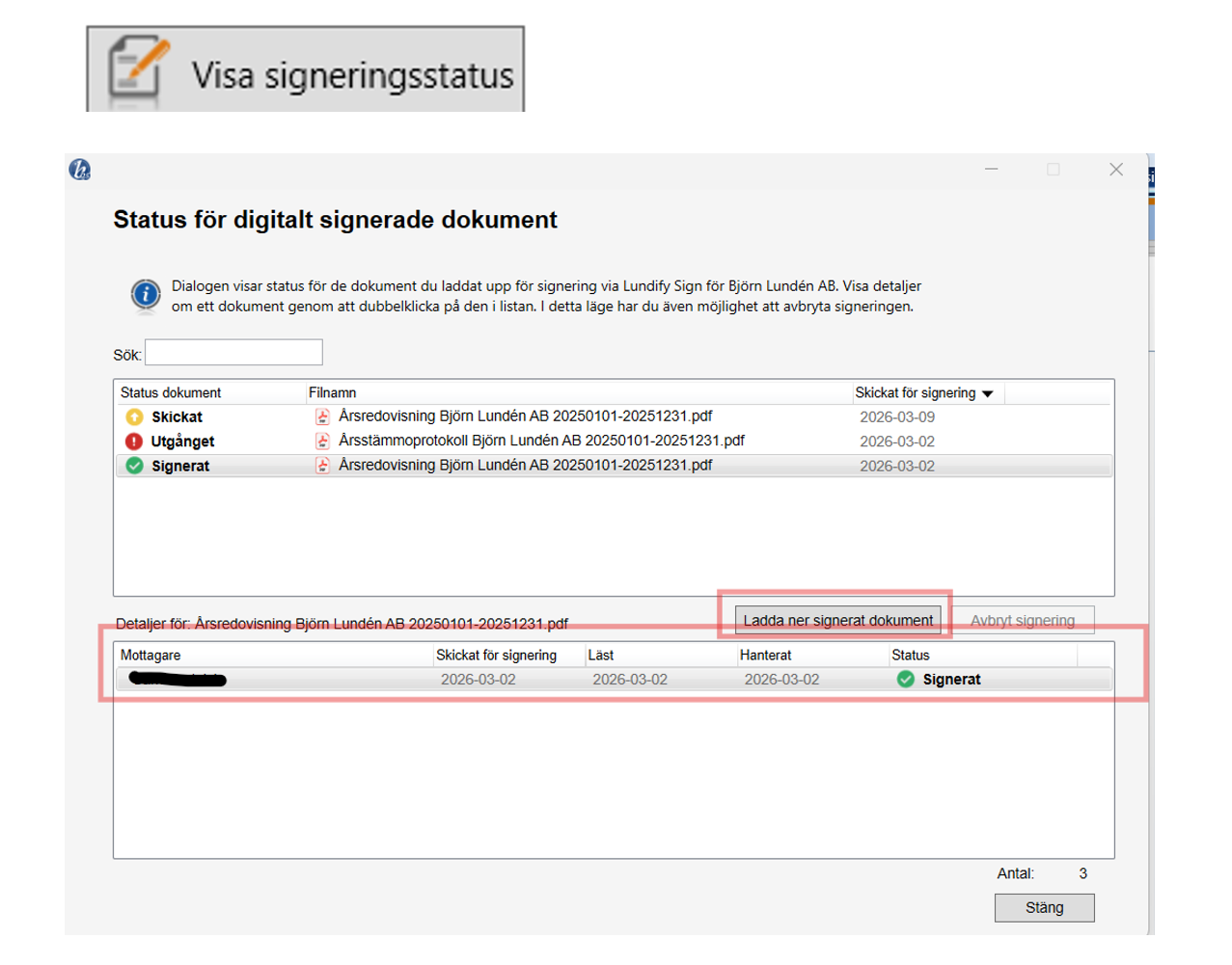 Om ett dokument är signerat och klart så kan du även i denna vyn ladda ner signerat dokument. Om du vill veta status på ett ivägskickat dokument för signering då dubbelklickar du på raden så kommer mer info nedan. Här kan du följa status för att se vilka mottagare har signerat och vilka har inte. Om det är t ex 8 som ska signera då kommer du nedan se allas status nedan så att du lättare kan följa upp processen.