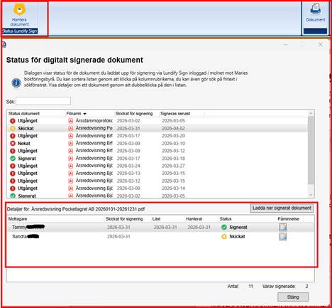 Vi har förbättrat översikt och utökat funktionalitet så att det bli enklare att följa statusar på dina skickade dokument för signering genom Lundify SIGN. För att få mer info om ett dokument dubbelklickar du på den raden som du vill veta mer om. Nedan öppnas ett till fönster med mer info så som vilka har läst, signerat, nekat osv. Du kan även här ladda ner ett signerat dokument.