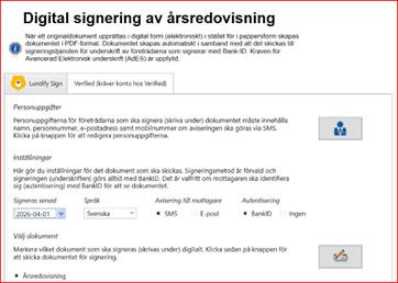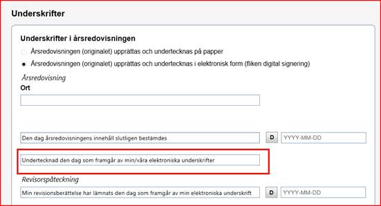 Om årsredovisningen ska signeras digitalt har vi lagt till ” Undertecknad den dag som framgår av mina/ våra elektroniska underskrifter”. Ni justerar texten om det är en eller fler som ska skriva under.