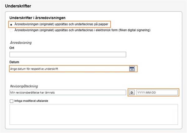 På fliken Digital inlämning har ett avsnitt gällande datering lagts till där man i en dialog kontrollerar hämtade datum/anger datum för respektive signatur så att de överensstämmer med originalet. I den här dialogen hämtas de datum som användaren har angett i vyn Underskrifter. Om datumen där inte är i ett fullständigt format (om dagen för undertecknandet var okänt vid utskrift av årsredovisningen) kompletterar man datumet här för vilken dag som undertecknandet faktiskt skedde.