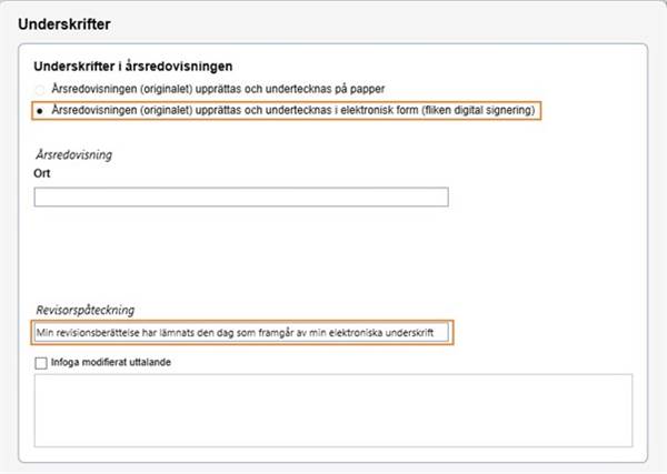 När man lämnar in en årsredovisning digitalt till Bolagsverket skapas en avskrift av årsredovisningen. Avskriften ska ha samma innehåll som originalet av årsredovisningen. Det innebär att det i avskriften ska framgå vilka datum som originalet av årsredovisningen undertecknades, oavsett om originalet undertecknades på papper eller elektroniskt.