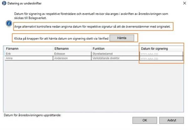 Om originalet har upprättats elektroniskt via vår integration med Verified (fliken digital signering) går det att hämta de datum som signering av årsredovisningen skedde via knappen Hämta.