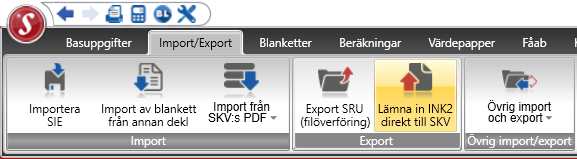 I denna version har vi nu ett nytt och enklare inlämningssätt för Inkomstdeklaration 2. Vi använder oss här av Skatteverkets API (Application Programming Interface) för detta. Rent praktiskt innebär det att BL Skatt kommunicerar direkt med Skatteverket utan att du behöver skapa några filer. Så när du står i deklarationen som du vill lämna in går du upp till Import/export och klickar på Lämna in INK2 direkt till SKV.