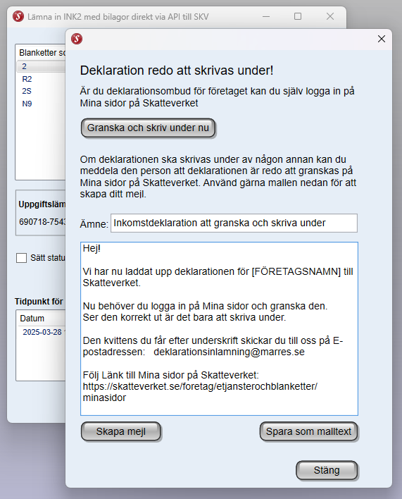 Är det kunden själv som ska skriva under den på Mina Sidor så kan du härifrån skapa ett mail som du sedan skickar iväg till din klient. Här kan du också spara ner en standardtext som mall till nästa gång du ska maila klienter. Beroende på standardmailprogram så kan du behöva klicka upp ditt mailfönster där det skapade mailet ligger.
