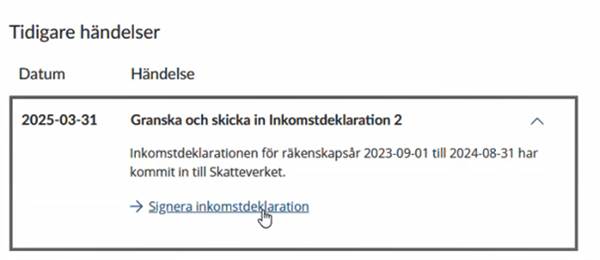 Är det du som ska signera deklarationen finns här en knapp för Granska och skriva under nu, som leder dig till inloggningssidan till Mina Sidor på Skatteverket.