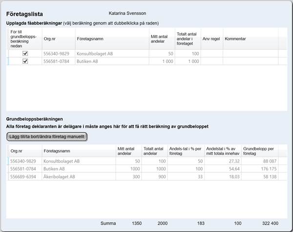 Vi har nu uppdaterat Fåab med beräkningar enligt nya beslutade regler för 2026. En stor förändring är att ett grundbelopp som är på 322 400 kronor (8 IBB) ska fördelas på en delägares ALLA innehav av kvalificerade andelar i onoterade företag (de som man gör K10 på). För att du bara ska behöva ange detta en gång i Fåab –oavsett hur många företag du har –så har vi utökat listan med dina Fåab-beräkningar med en beräkning av grundbeloppet. Gör du inte kompletta fåab-beräkningar på alla dina företag kan du manuellt lägga in ditt andelsinnehav per den 1 januari 2026.