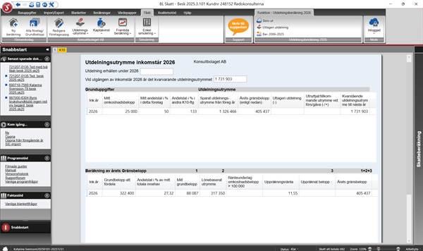 Utdelningsberäkningen för 2025 fungerar enligt de gamla reglerna. Det är när du väljer Framtida beräkning som du ser den nya resultatsidan för beräkning av utdelningsutrymmet 2026.